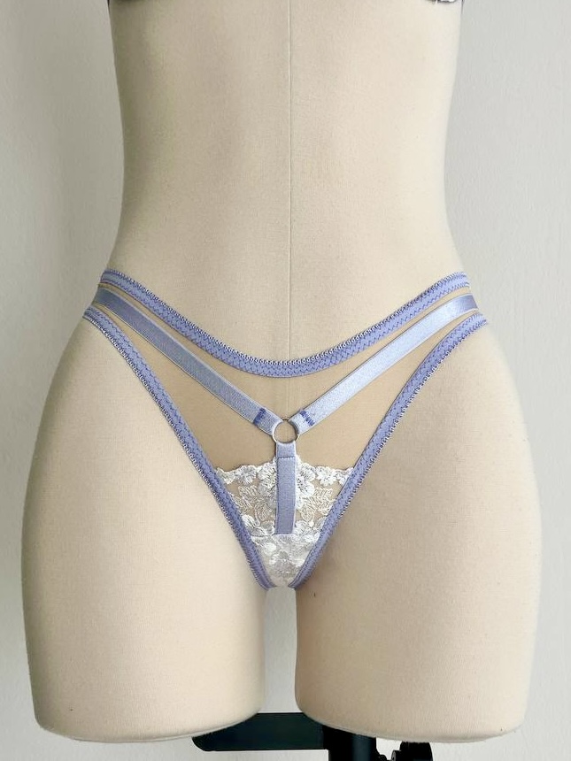Il più audace della collezione. Davanti ha un piccolo pannello in pizzo con elastici che formano una V profonda. I fianchi e il dietro sono costruiti quasi interamente con elastici e anelli metallici, e sul retro c’è una grande apertura centrale che lo rende davvero particolare. È un modello che gioca con i pieni e i vuoti, perfetto se vuoi spingerti un po’ oltre nella creatività.